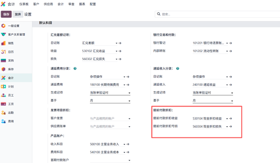提前付款折扣功能,可帮助企业自动核算发票在约定付款到期日前完成结算产生的财务影响。在Odoo 19会计模块中,通过专门的默认科目配置,该流程可实现全自动化,用于记录提前付款结算产生的收益或损失。