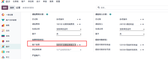 为了更清晰地理解Odoo 19会计模块中默认科目的运作逻辑,我们以发票行折扣为例,进行实操演示。在本案例中,我们已预先配置了【发票折扣】科目,用于记录客户发票上的销售折扣。