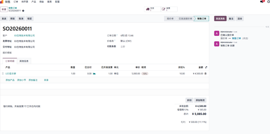 输入折扣信息后,点击【确认】按钮完成销售订单的确认。此时报价单将转为已确认订单,进入开票与发货流程。