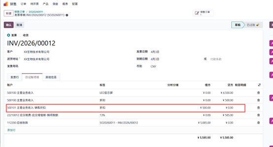 发票完成确认后,Odoo会在会计模块中生成对应的日记账分录。此时,系统会根据已配置的默认科目,将折扣金额与实际销售收入分开核算:折扣金额将自动过账至已配置的【发票折扣】科目,剩余的净销售收入则计入对应的收入科目。