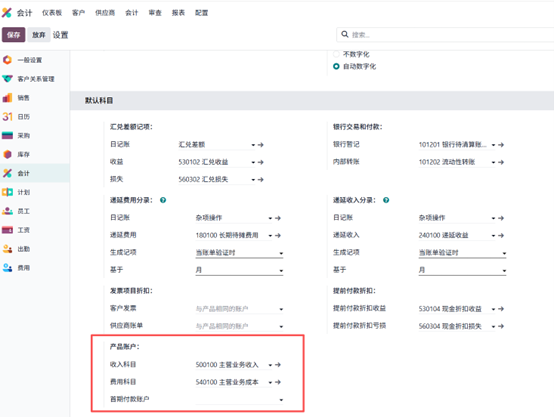 产品科目,决定了与商品、服务相关的财务交易在会计系统中的核算规则。在Odoo 19会计模块中,通过这些默认科目的配置,每当创建发票、账单等交易单据时,与产品相关的收入、费用、预付款项,将自动过账至对应的分类账中。