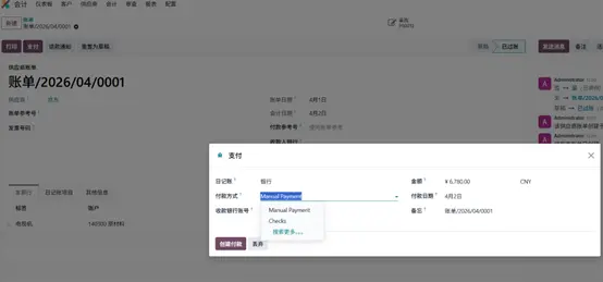 Odoo 19中的供应商付款流程,需基于已确认的供应商账单启动,账单创建流程如下: