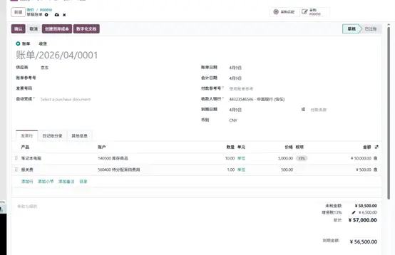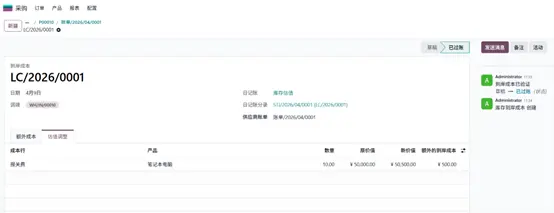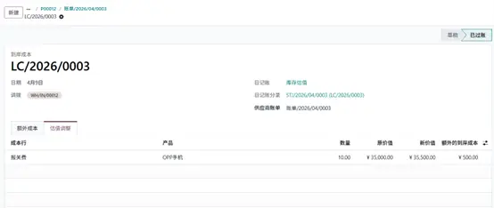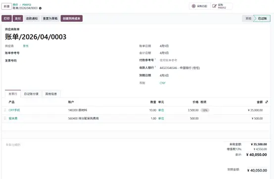 产品入库后,创建供应商账单,并添加已设置好的到岸成本服务产品。