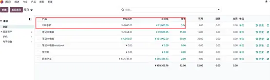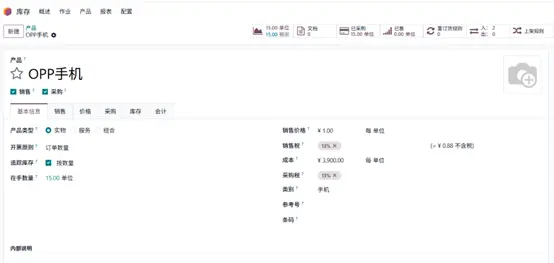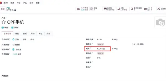 创建新产品“OPP手机”,初始无成本。