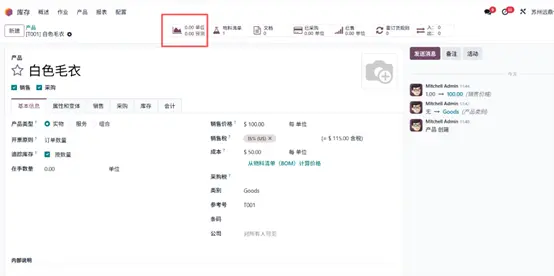点击智能菜单中的 物料清单(Bill of Materials) 选项,系统将弹出新窗口,展示为 “白色毛衣” 产品创建的物料清单,可直接用于生产。组件(Components) 选项卡中列示了生产该产品所需的全部原材料,本例中原材料库存充足,可满足大批量生产需求。