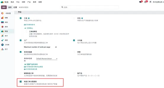 随后进入配置(Configuration)> 设置(Settings),启用 生产订单物料分配报表(Allocation Report for Manufacturing Orders) 选项,以便生成生产订单物料分配报表,操作完成后保存设置。