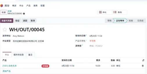 为客户Amy Watson创建了一张新交货单,需求为 10件白毛衣,计划交货日期为 4 月 28日。当前库存无法满足该需求,尽管订单数量为 10,但产品可用状态显示为不可用(Not Available),该交货单处于待处理状态。