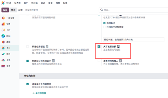 2. 在 **客户发票** 区域,启用 **金额大写**