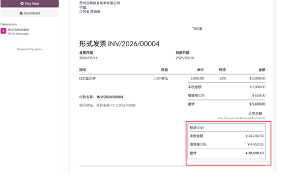Odoo 19 支持**发票金额大写**功能,让发票更清晰、规范、正式,可避免金额误解,满足银行或法定要求。