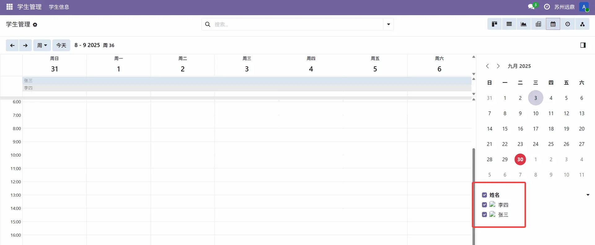 - color:基于指定字段(通常是 Many2one 字段)为不同事件分配颜色。该字段值相同的记录会显示为同一颜色。