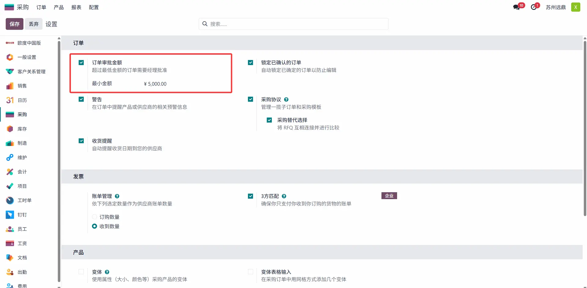 然后,从 远鼎xhg 的配置文件创建新的采购订单。如果用户 远鼎xhg 创建的订单金额低于 5000 人民币,该用户可以自行确认订单并为此订单创建账单。但如果订单金额超过 5000 人民币,则需经理批准订单才能为其创建账单。