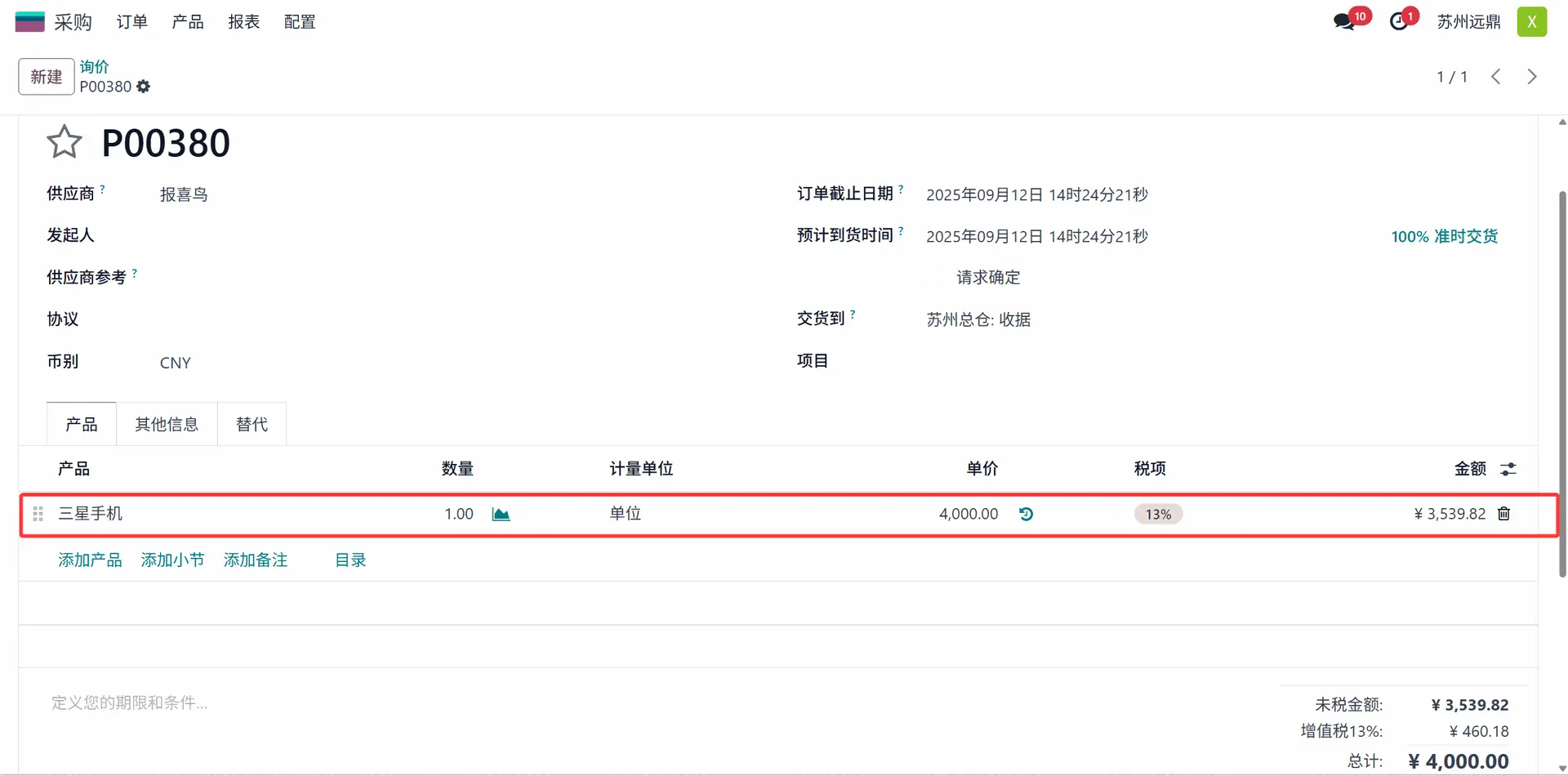 转到采购模块,从 远鼎xhg 的配置文件创建新的询价单。并确保订单金额不超过 5000 人民币。
