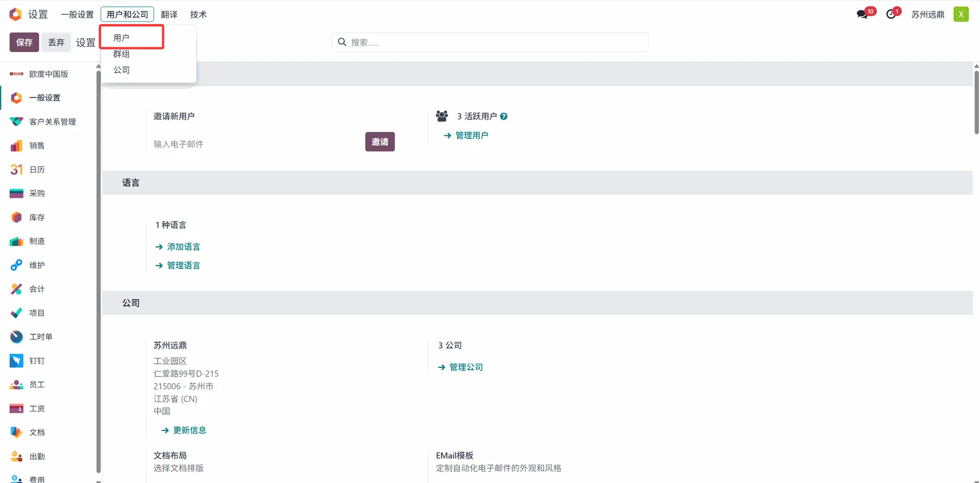 在“通用设置”的“用户和公司”下,有一个“用户”子菜单。