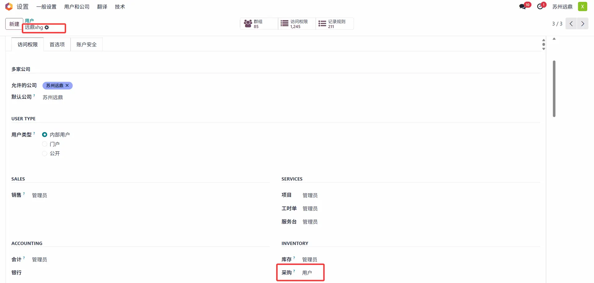 启用审批功能后,需通过权限设置控制 “谁可以审批订单”。在 Odoo 18 中,采购模块的权限分为 “普通用户(User)” 和 “管理员(Administrator)” 两类,仅管理员有权审批订单。