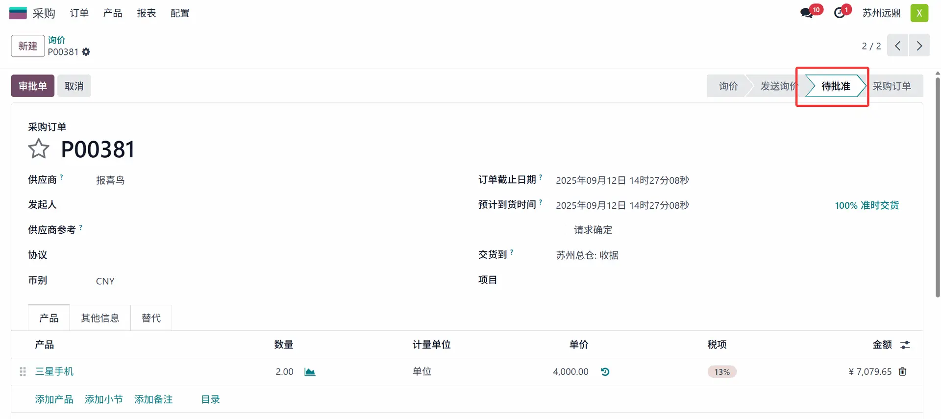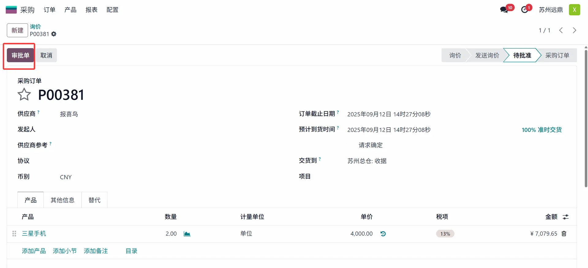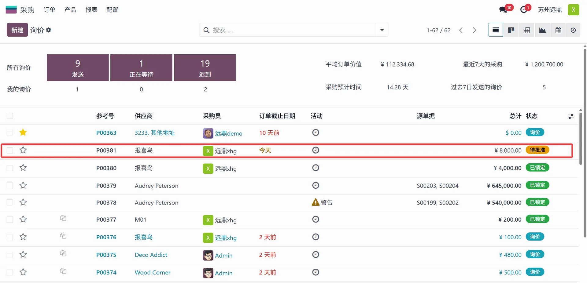 管理员进入采购应用后,可以轻松识别处于“待批准”状态的采购订单,如上图所示。选择该询价单并打开。