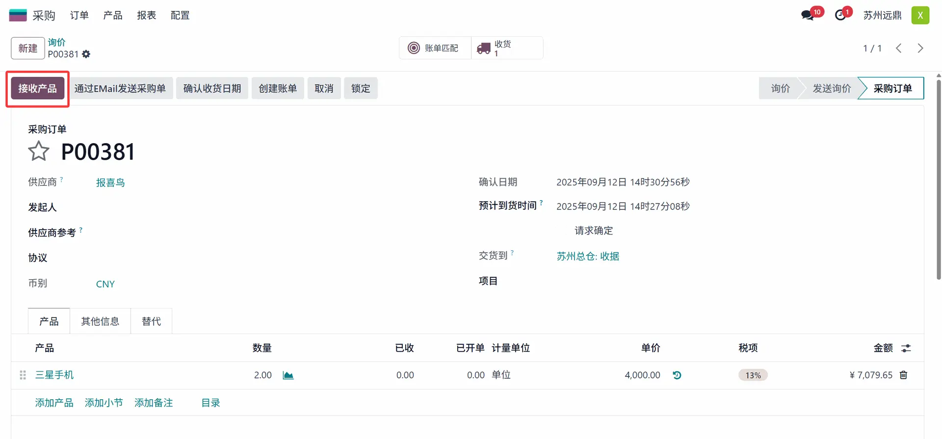 点击“接收”按钮,用户可以在采购订单中接收产品。点击“接收”按钮后,点击“验证”按钮以验证收货单。