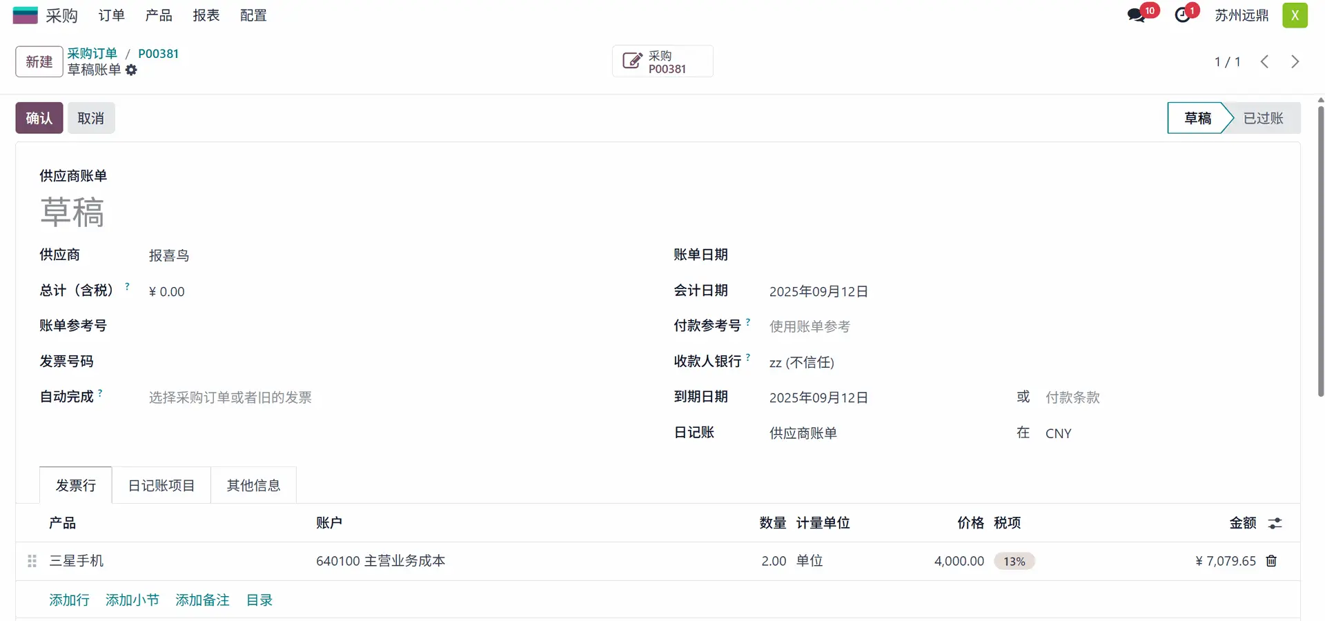 点击“确认”按钮以确认供应商账单。在此采购订单中,询价单由用户创建,管理员批准询价单后,该询价单变为采购订单,用户再为同一采购订单创建账单。
