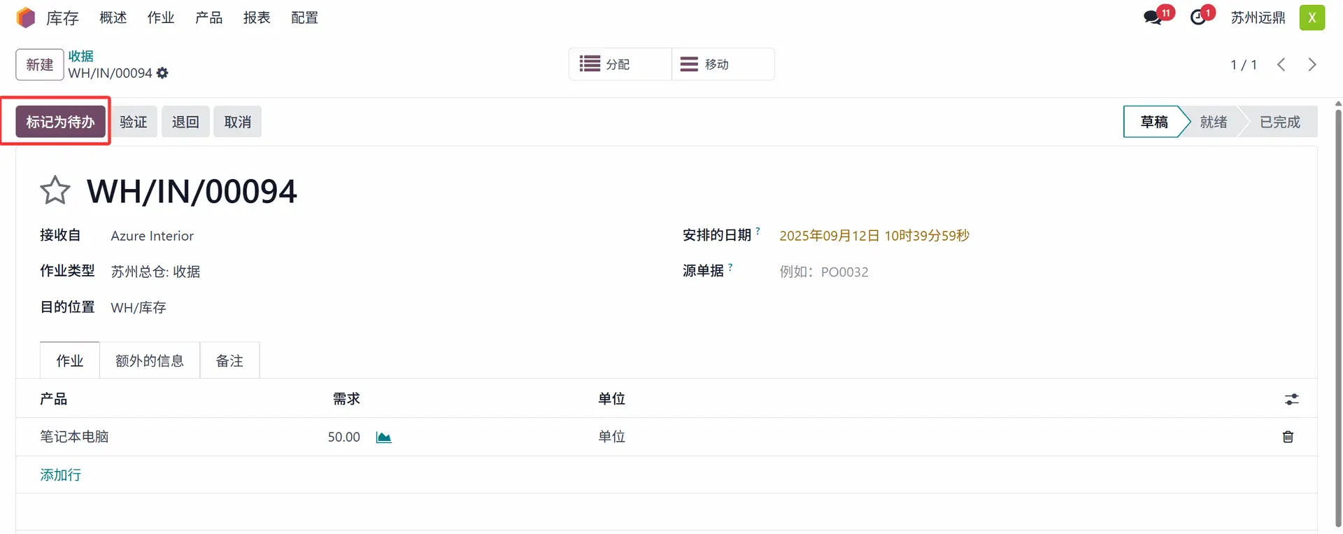 收货阶段将变为“完成”,调拨完成,产品到达库存位置。如下面的截图所示,将会出现一个名为“分配”的智能选项卡。