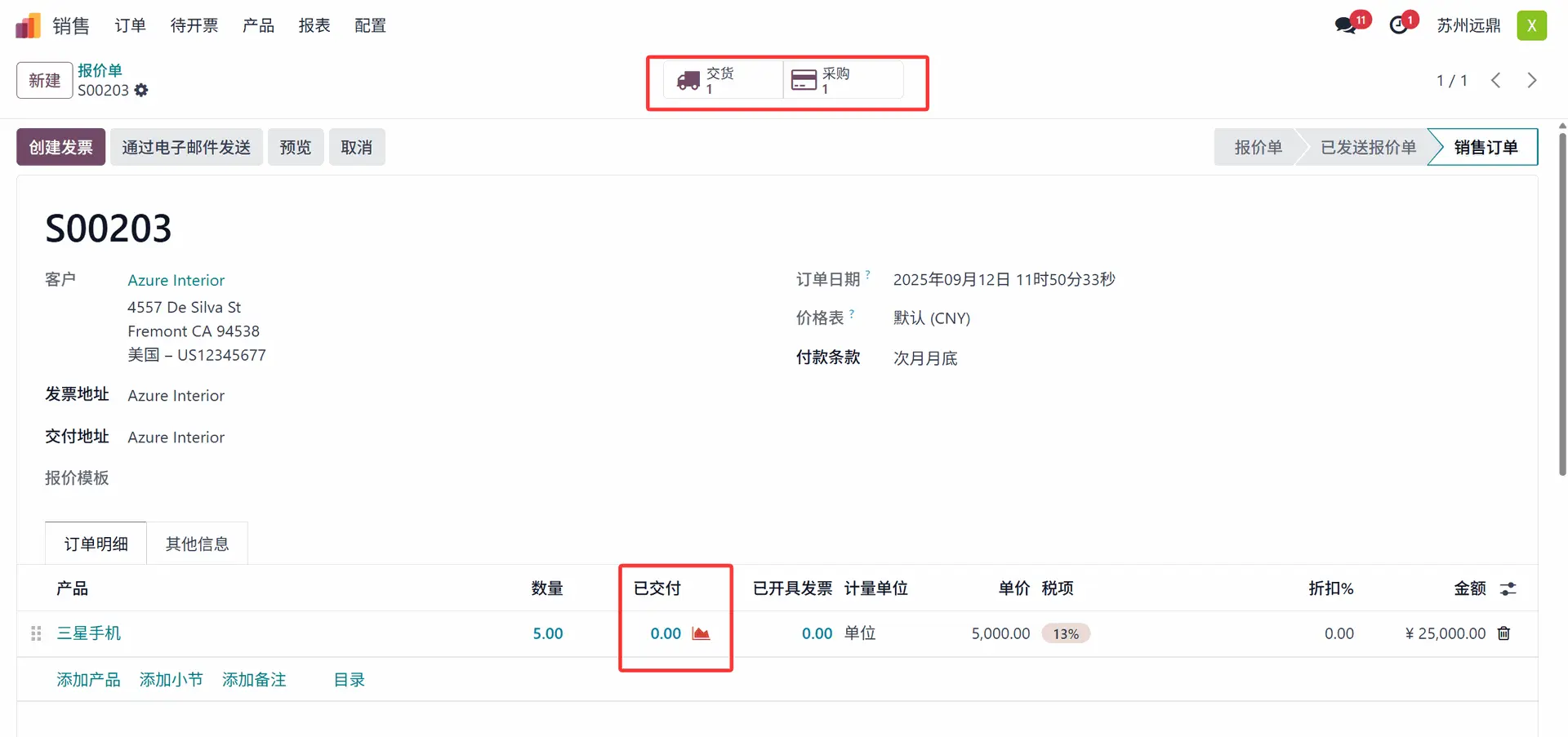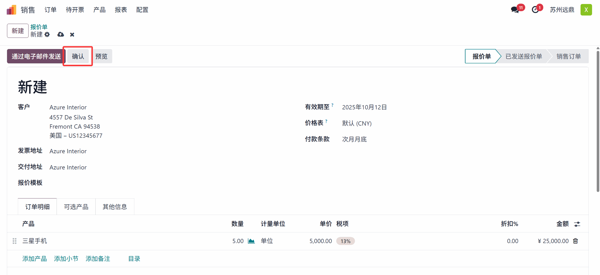 产品配置完成后,添加新的销售订单。选择的客户是 Azure Interior,客户下了 5 台的订单。确认报价。