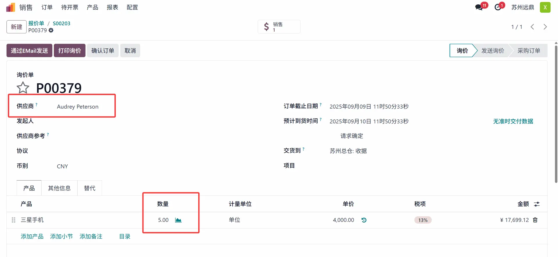 打开采购订单查看,供应商是 Abigail Peterson,与产品中提到的相同。