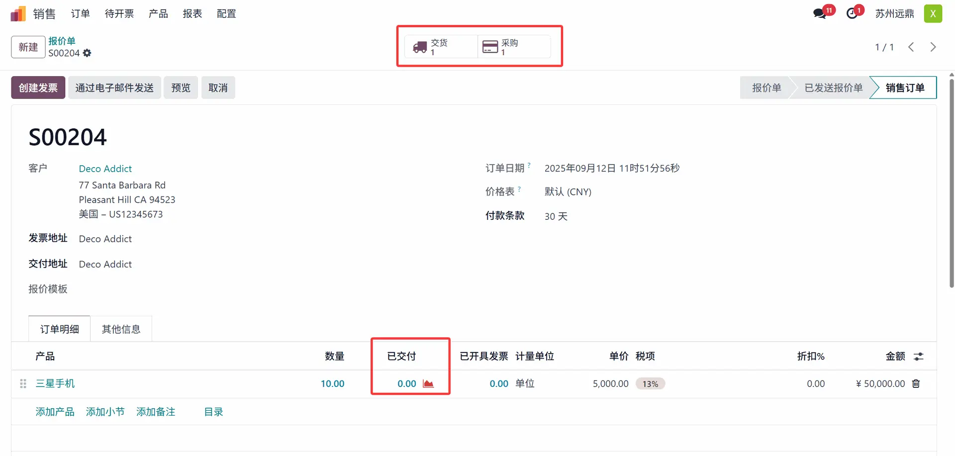 在确认采购之前,为另一位客户创建另一个销售订单。这次客户是 Deco Addicts,客户需要同一产品“三星手机”,请求数量为 10。确认订单。