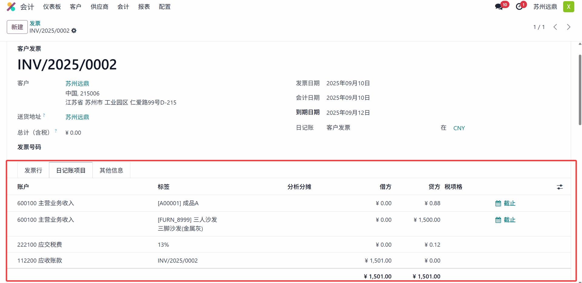 正确填写这些字段后,点击“确认”按钮,发票将从草稿状态变为已过账状态。随后将创建与发票对应的日记账条目。转到“日记账项目”选项卡,将显示日记账项目。