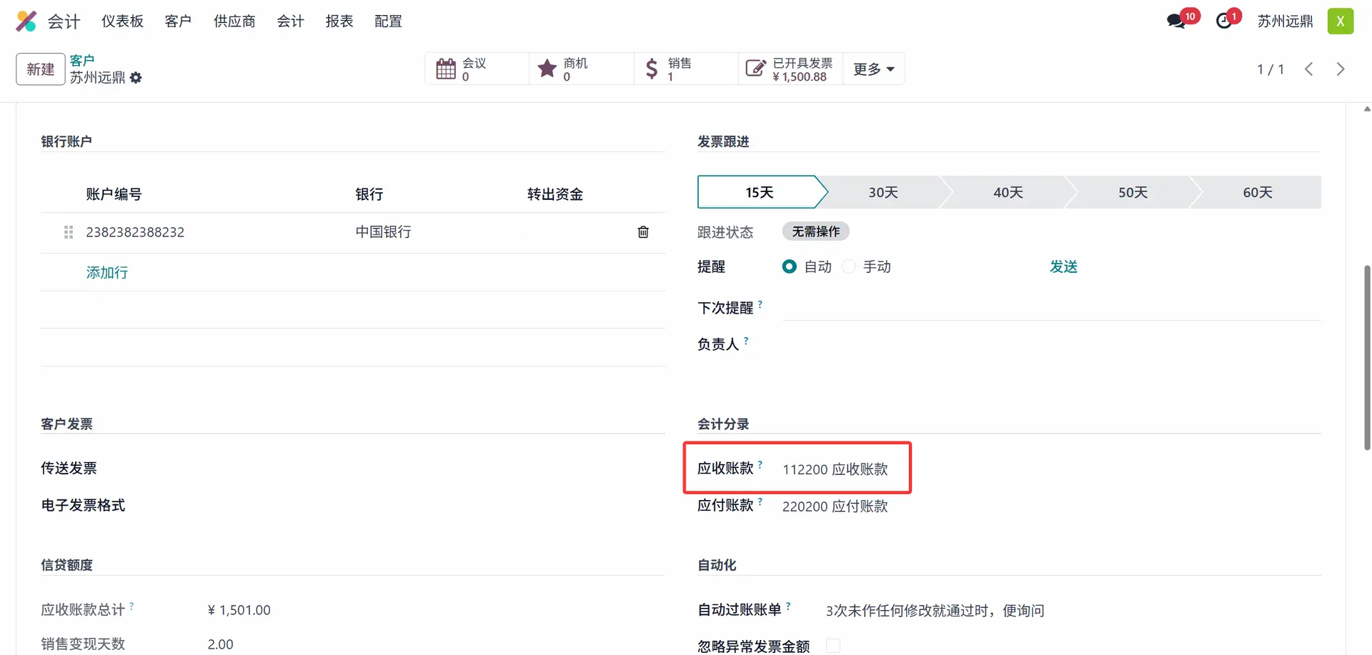 最后,应收账款账户是一个应收账户,其性质是资产。资产的增加会增加账户的借方金额。转到客户模板时,在“会计”选项卡下有一个“会计分录”部分。默认的应收账款账户在此配置。