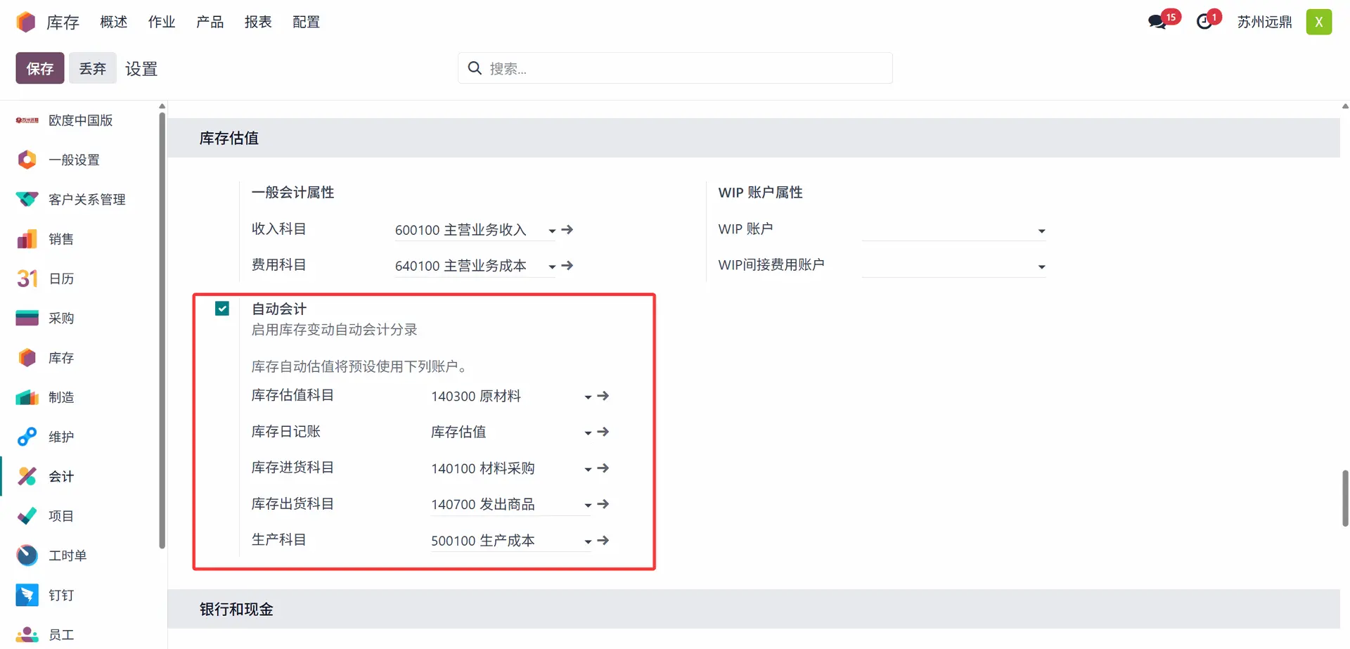 库存估值设置在产品类别 (Product Categories) 内部。要获取产品类别中的库存账户,用户需要从会计模块的设置中启用自动记账 (Automatic Accounting)。