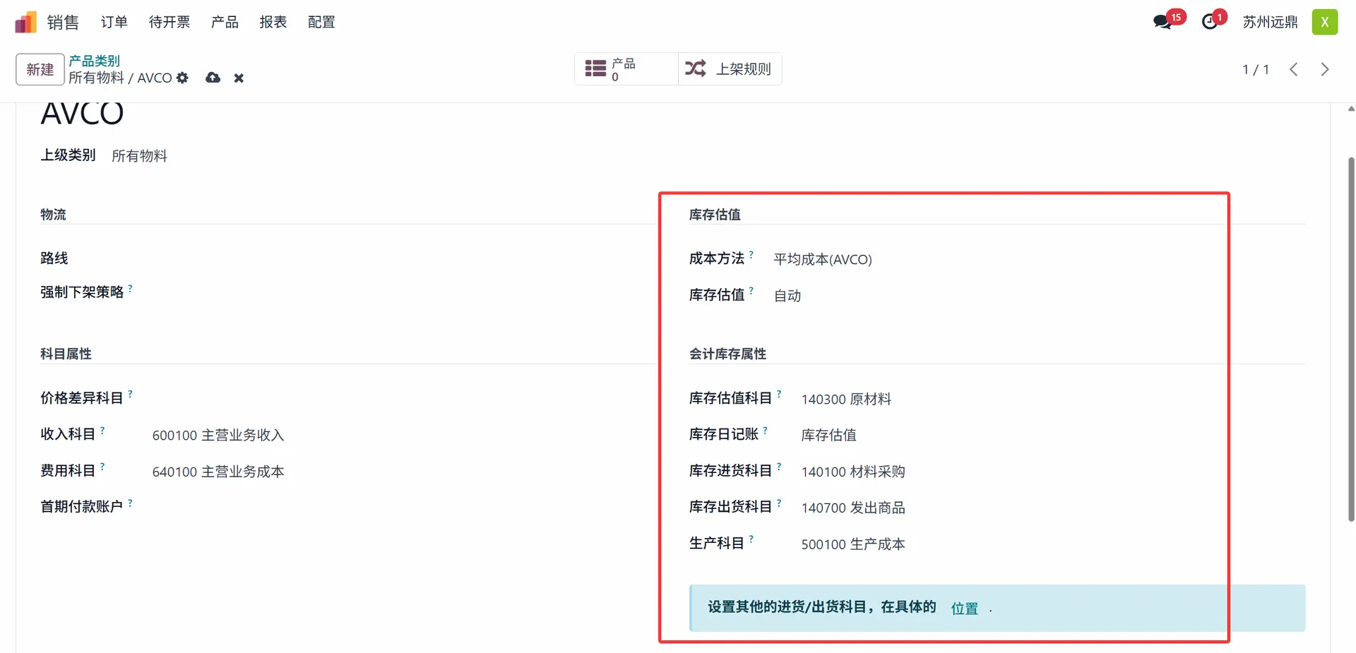 • 库存估值科目 (Stock Valuation Account):启用自动库存估值后,此账户将包含产品的当前价值。