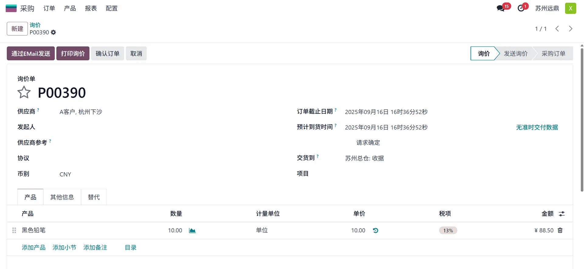 现在,让我们为10个该产品起草一份采购订单,每个成本为20人民币,并按如下所示确认订单。这里的客户是 A客户。