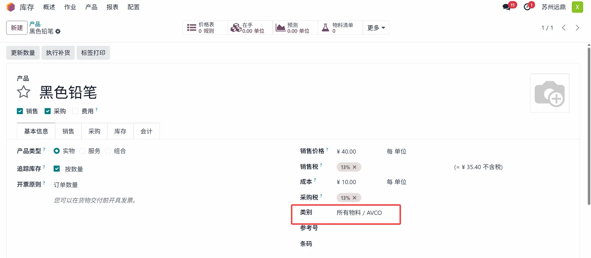 通过物品的入库和出库移动,将帮助我们掌握 Odoo 18 库存估值的基础知识。让我们通过创建一个新产品“黑色铅笔”来实现这一点,其产品类别也如下所示指定。