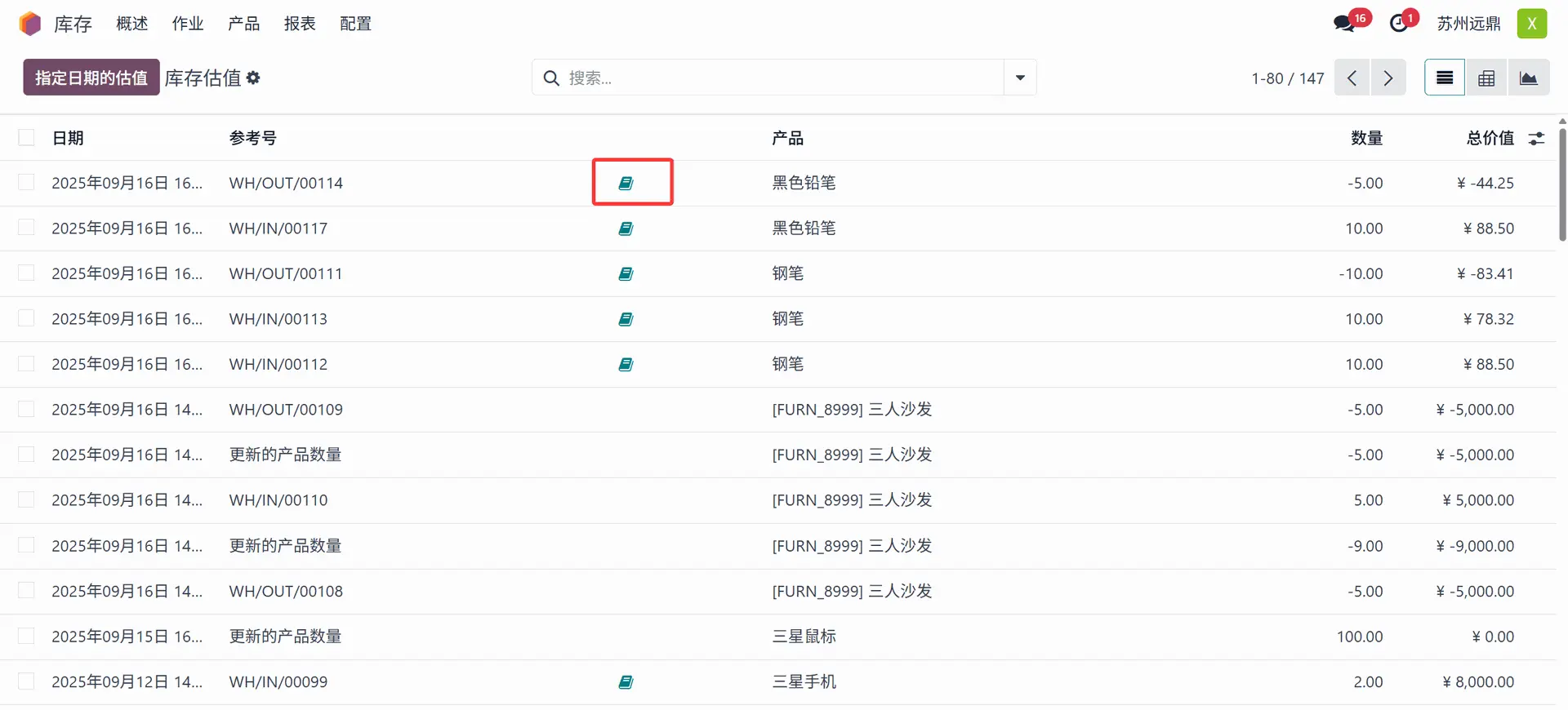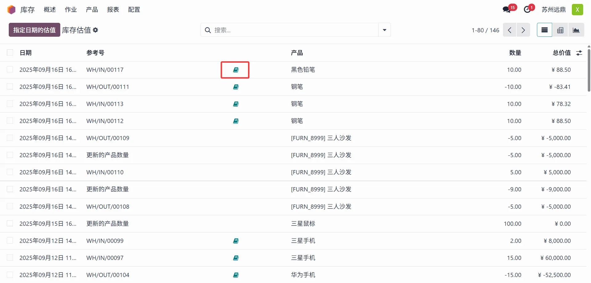 如下所示,“估值”菜单提供诸如日期、参考、产品、移动数量、单位价值、计量单位和总价值等信息。那里显示一个“账簿”图标 (Book icon),点击它可以查看库存日记账分录。