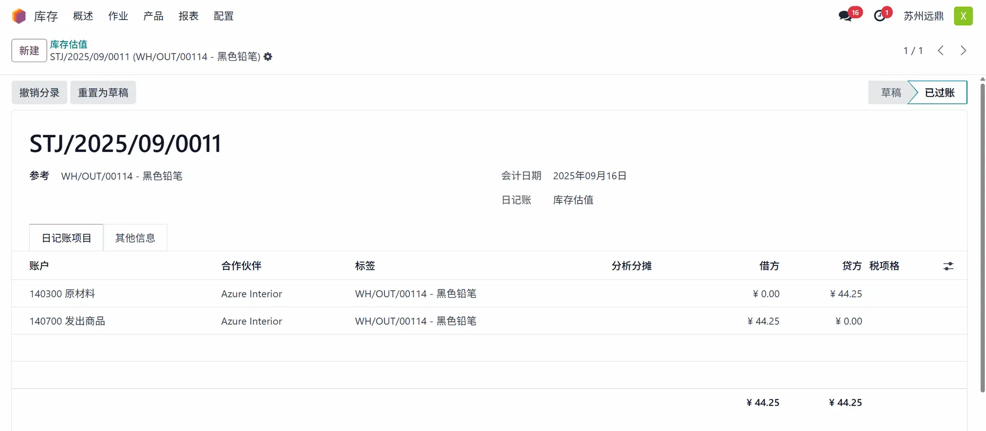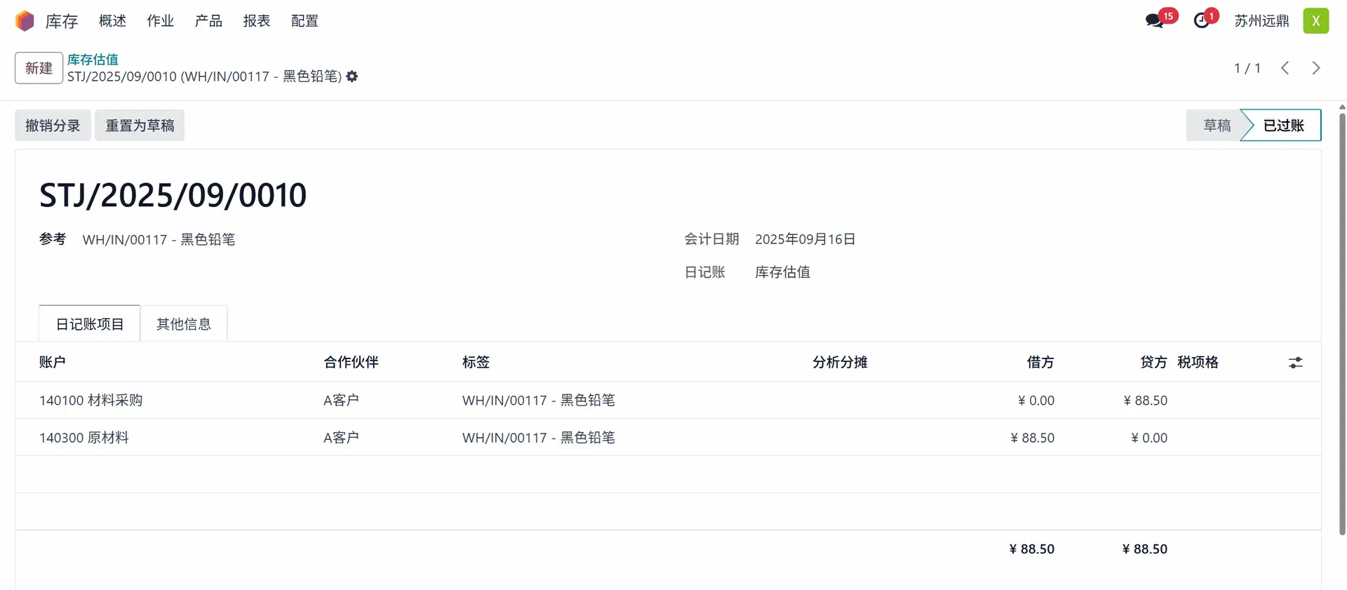 3. 在会计模块中查看库存估值相关分录