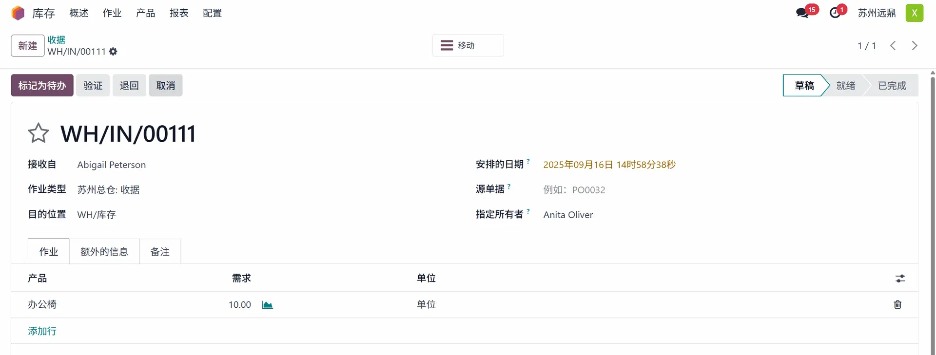 如上图所示,从供应商 Abigail Peterson 收到的产品,分配的所有者是 Anita Oliver。在“操作”选项卡中选择了 10 个数量的 办公椅。点击“标记为待办”按钮。