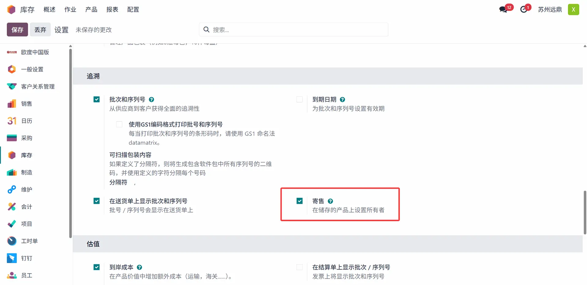 首先,打开 Odoo 18 库存模块。点击“配置”菜单并选择“设置”。在“追溯”部分下,启用“寄售”。