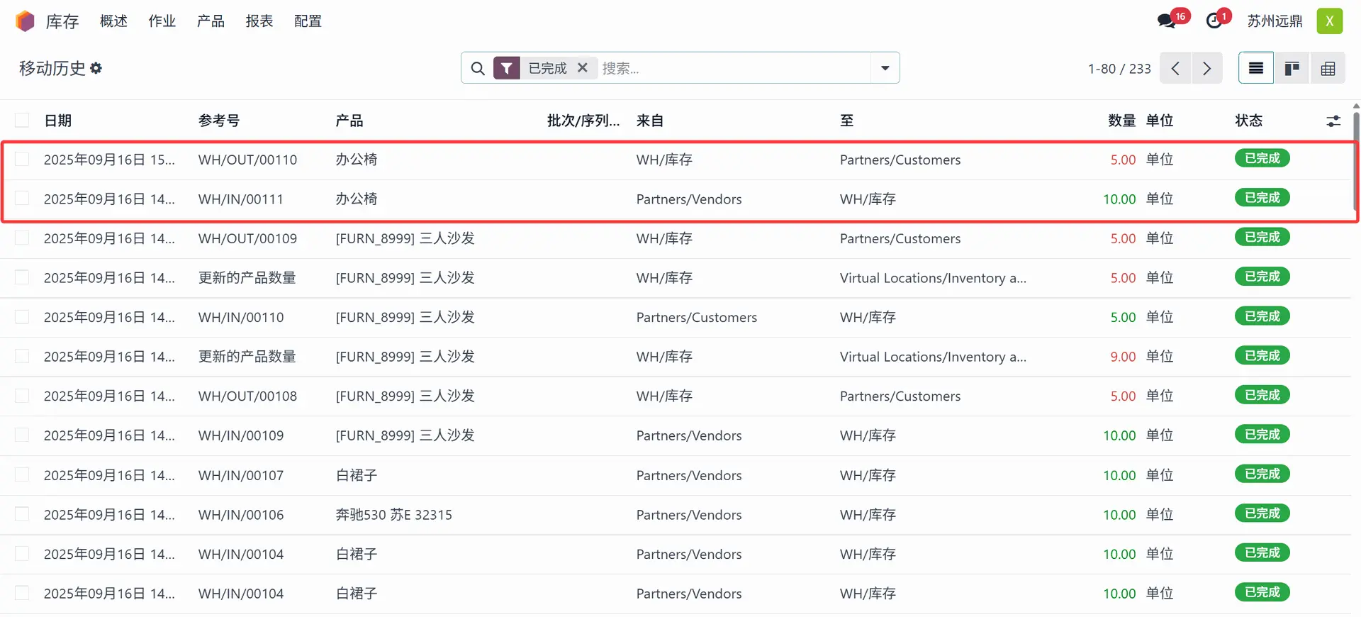 “报表”菜单的“移动历史”部分显示了当前正从某个存储位置移动到另一个库存的产品。让我们检查此项以确认调拨。下面详细列出了产品的日期、参考、产品、批次/序列号、来源、目的地、数量、单位和状态。