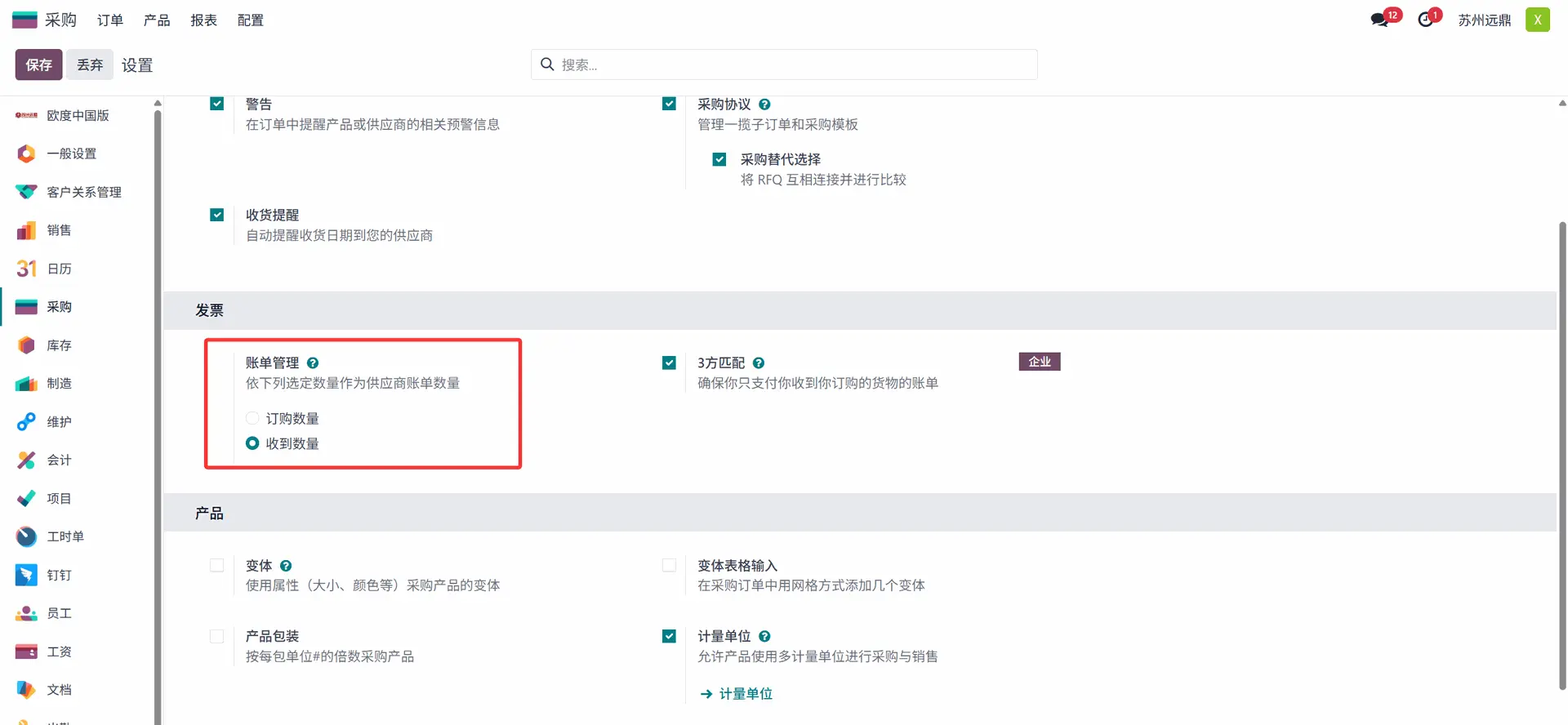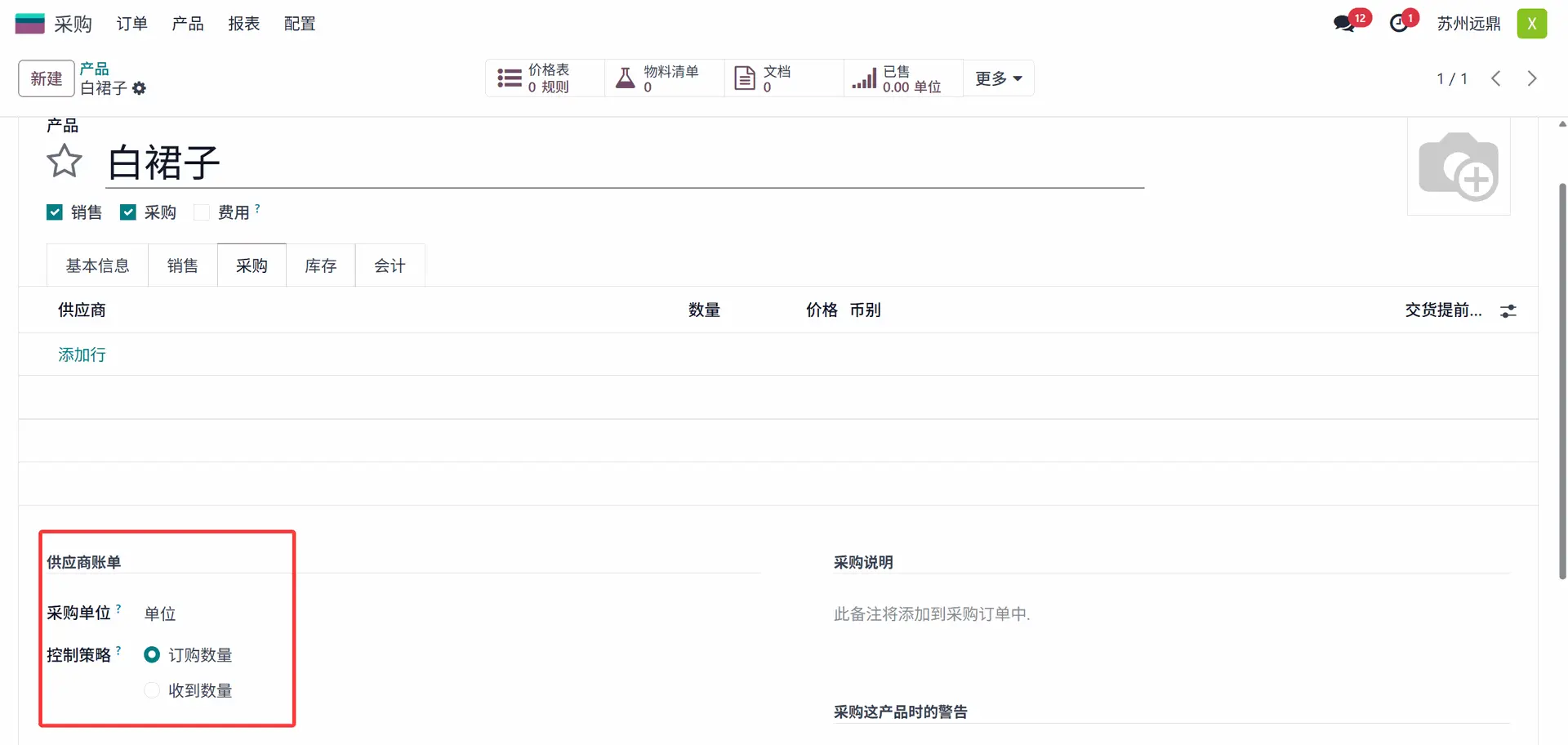 操作方法:导航至 产品 --> 产品,选择一个产品。在产品表单中,点击采购选项卡。在供应商账单部分,修改控制策略字段中的选择。