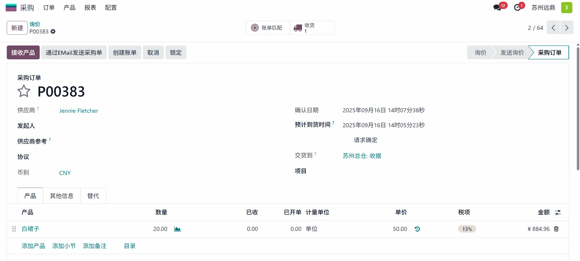 现在,在采购模块中创建一个新的“询价请求”(RFQ)。在订单行中选择新创建的产品,指定所需数量,并确认 RFQ。采购订单一经确认,您就可以继续接收产品并验证要接收的数量。