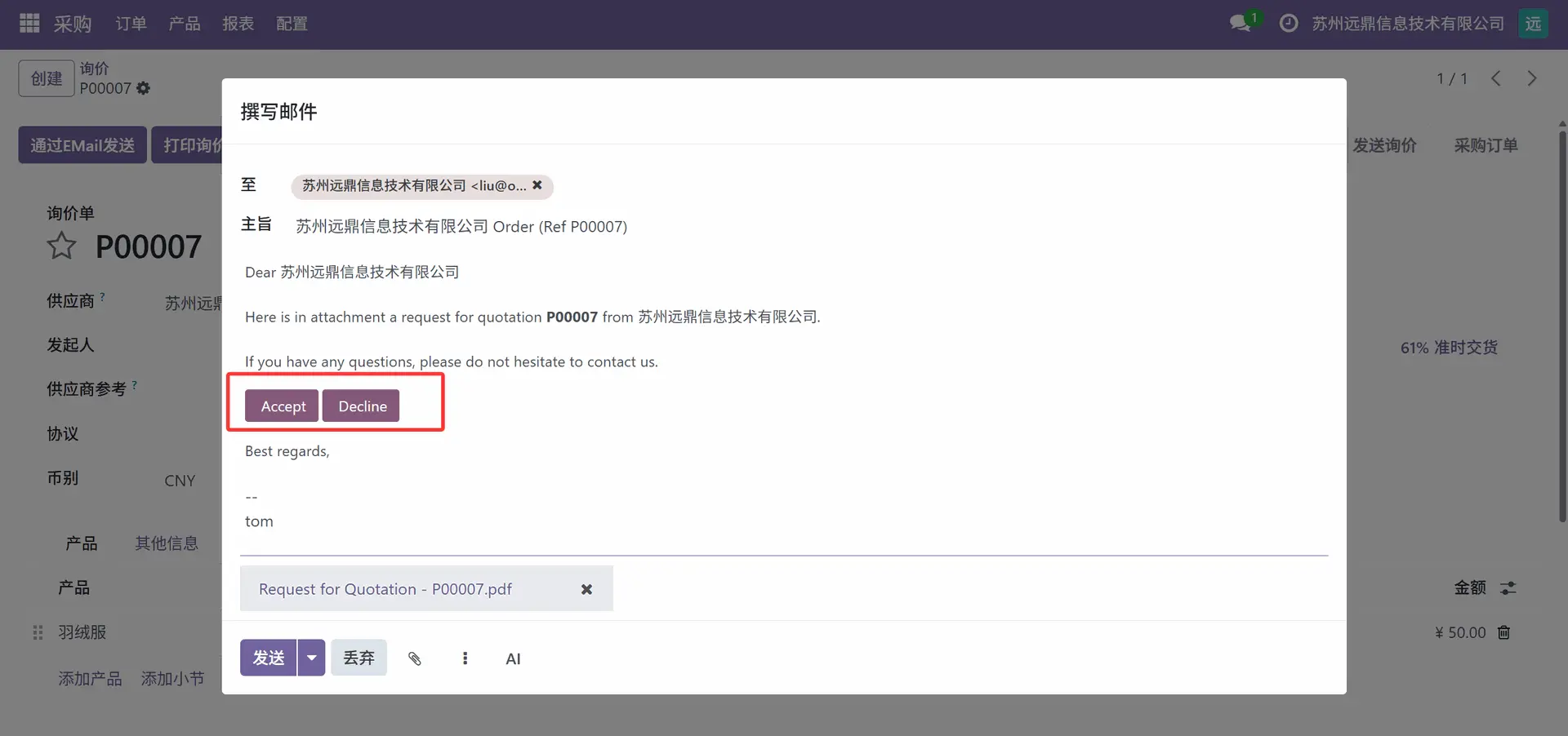 如果供应商接受了询价请求,讨论区中添加的消息将是“供应商已确认询价。”;如果供应商拒绝了他通过电子邮件收到的询价请求,讨论区中显示的消息将是“供应商已拒绝询价”。根据讨论区中显示的消息,用户可以确认该询价请求。