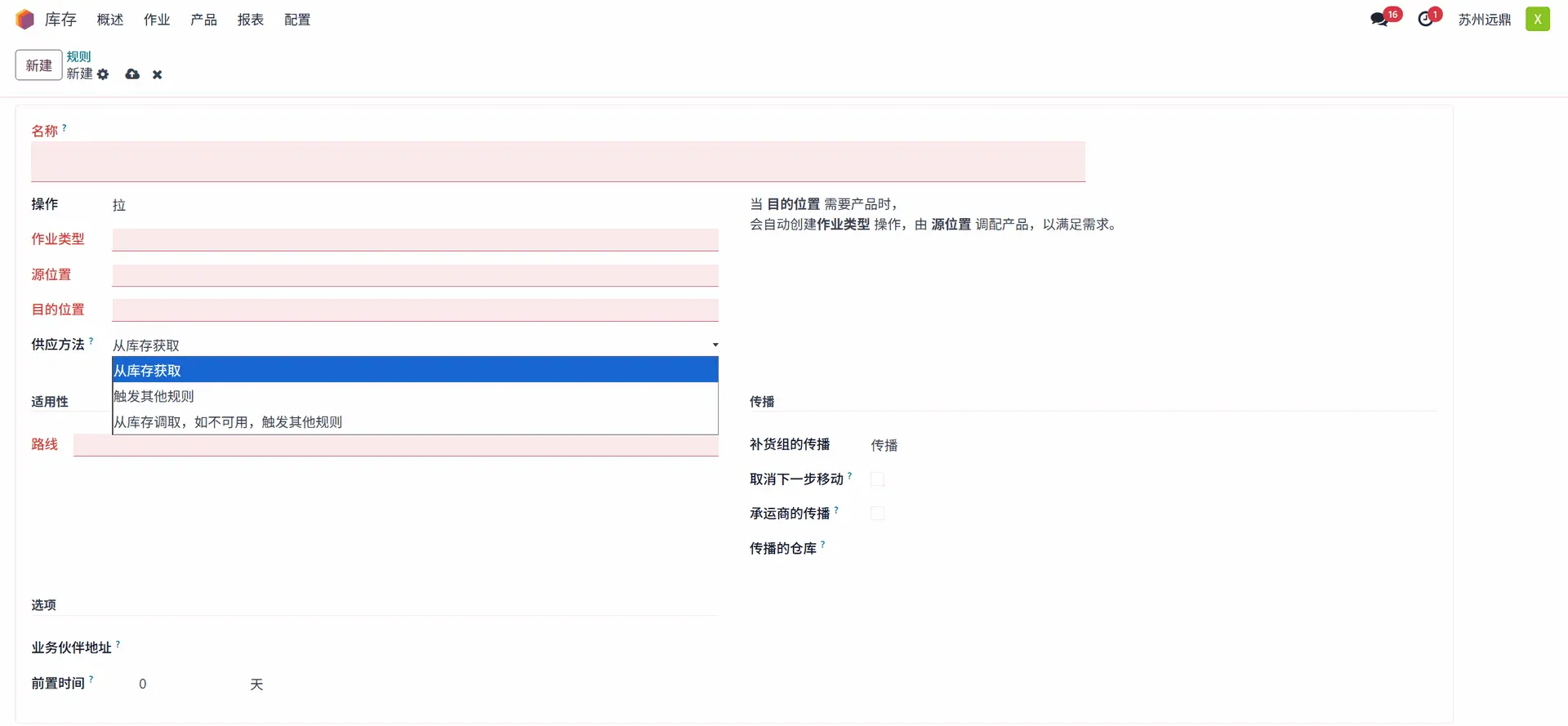 • 从库存调取,如不可用,触发其他规则 (Take From Stock, Trigger if Unavailable):产品从源位置的库存中提取。如果没有可用库存,系统会寻找规则将产品交付到源位置。