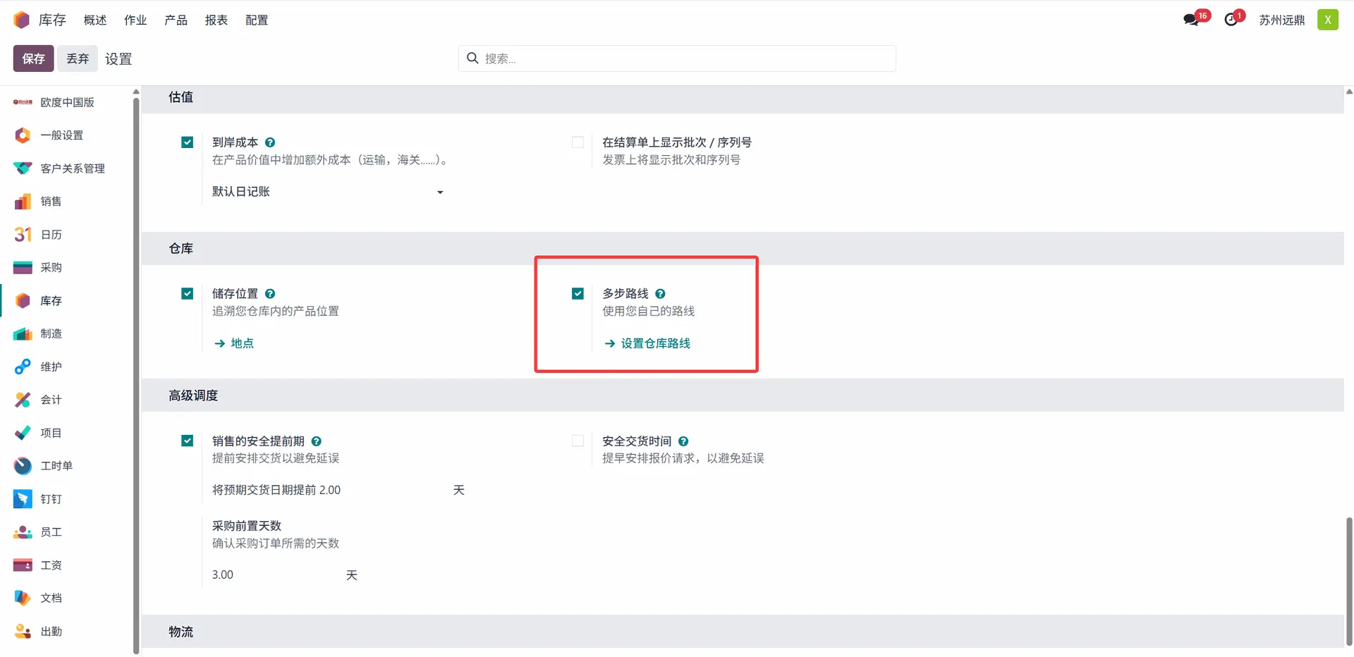 启用 多步路线 后,与其关联的 存储位置(Storage Location) 功能也会自动激活。接下来我们将重点讲解如何为企业商品移动配置规则。