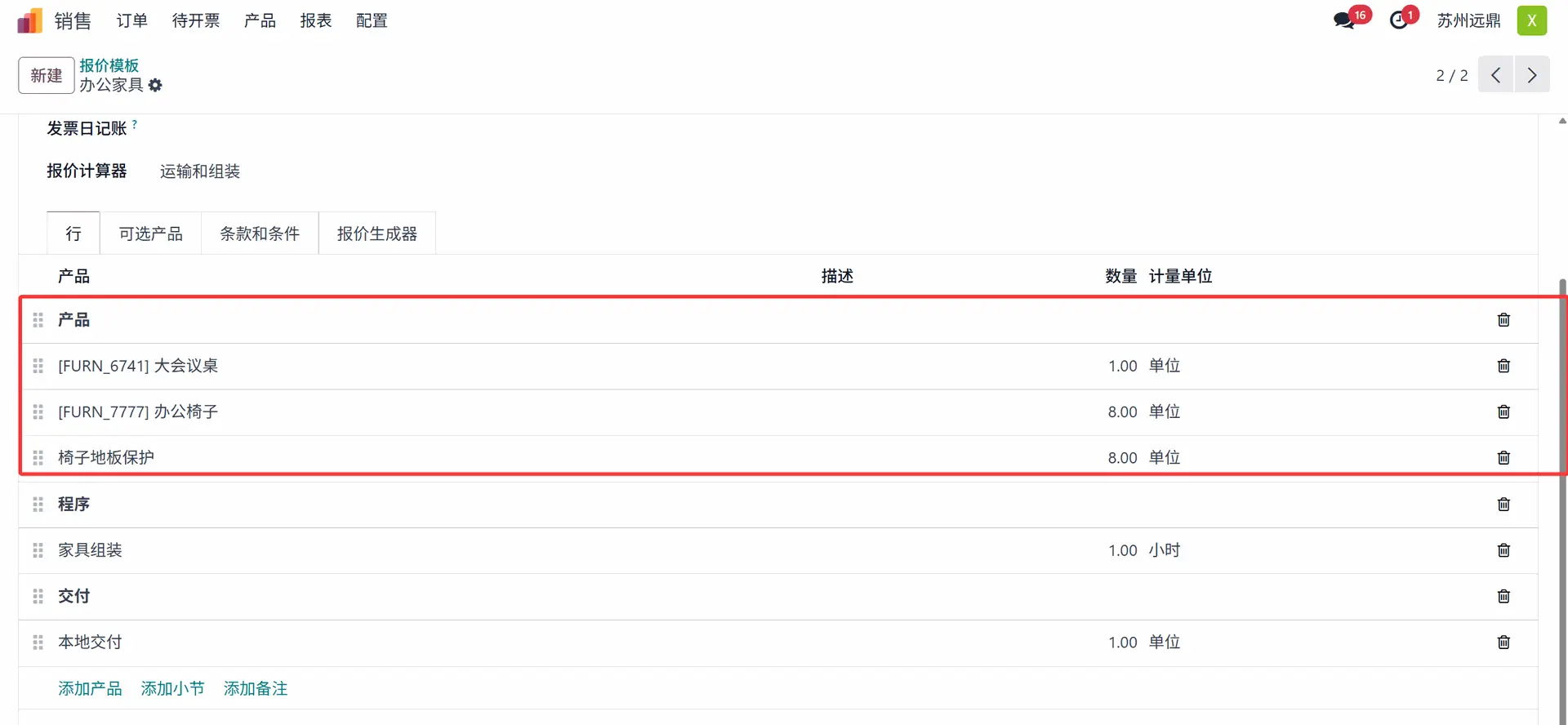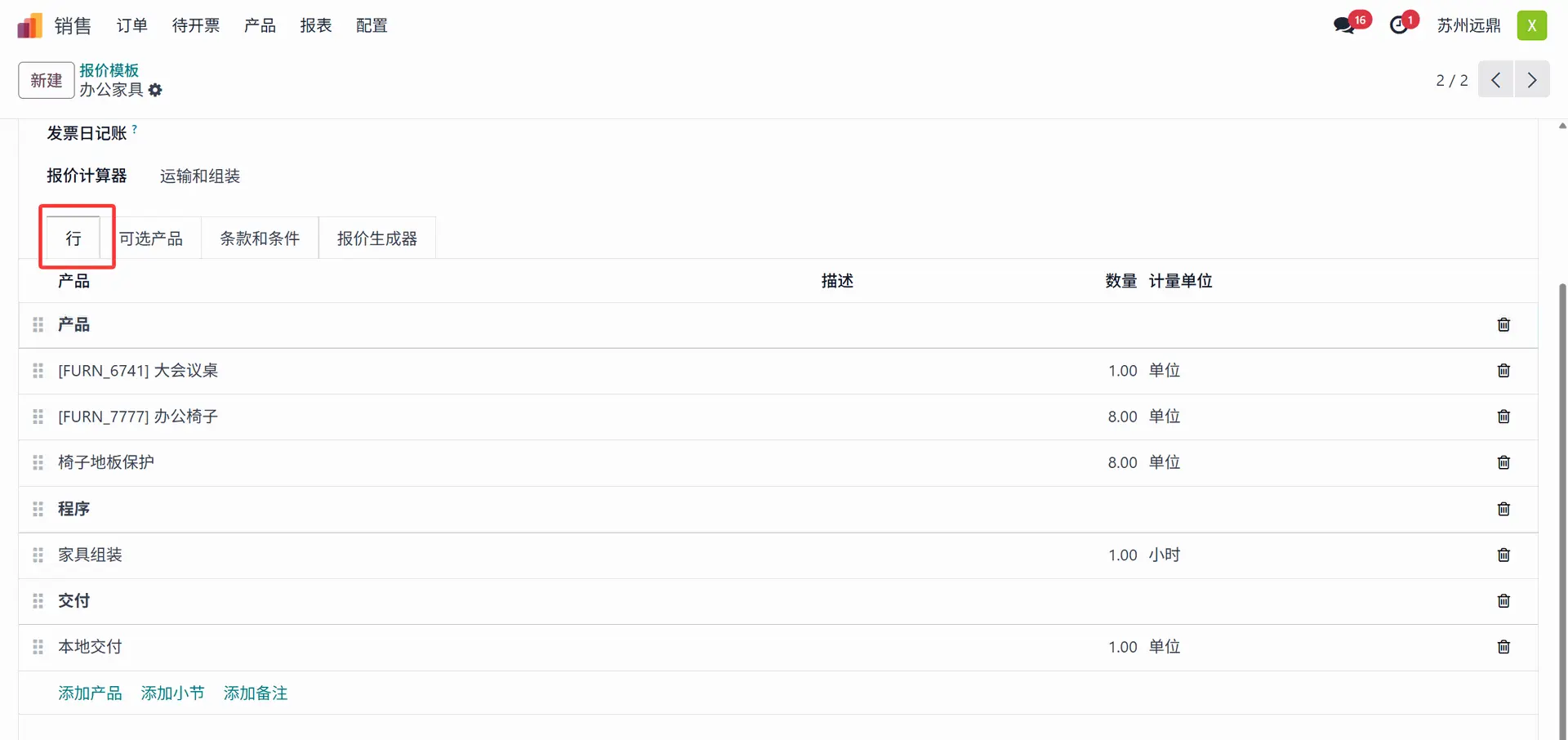 “行”选项卡包含用户需要包含在报价中的产品列表。这里的报价模板是为用作办公家具的产品创建的。行内部包含三个部分:产品、程序和交付。