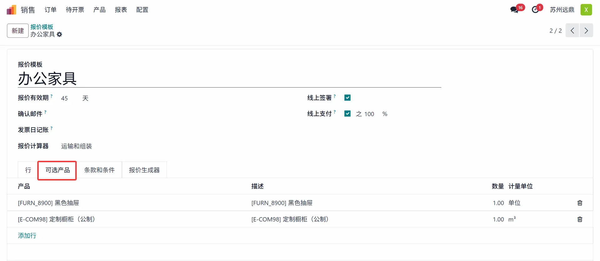 报价模板的下一个选项卡用于添加一些可选产品。这里添加了“黑色抽屉”和“定制橱柜”。
