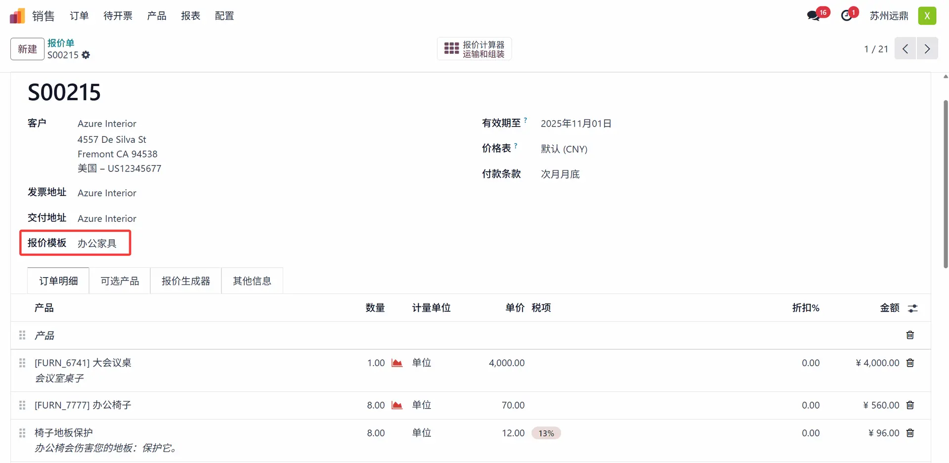 报价模板需要一个名称来标识。新建一个模板命名为“办公家具”。在名称之后,用户应添加报价有效期、确认邮件、公司、发票日记账、报价计算器、在线签名和在线支付。