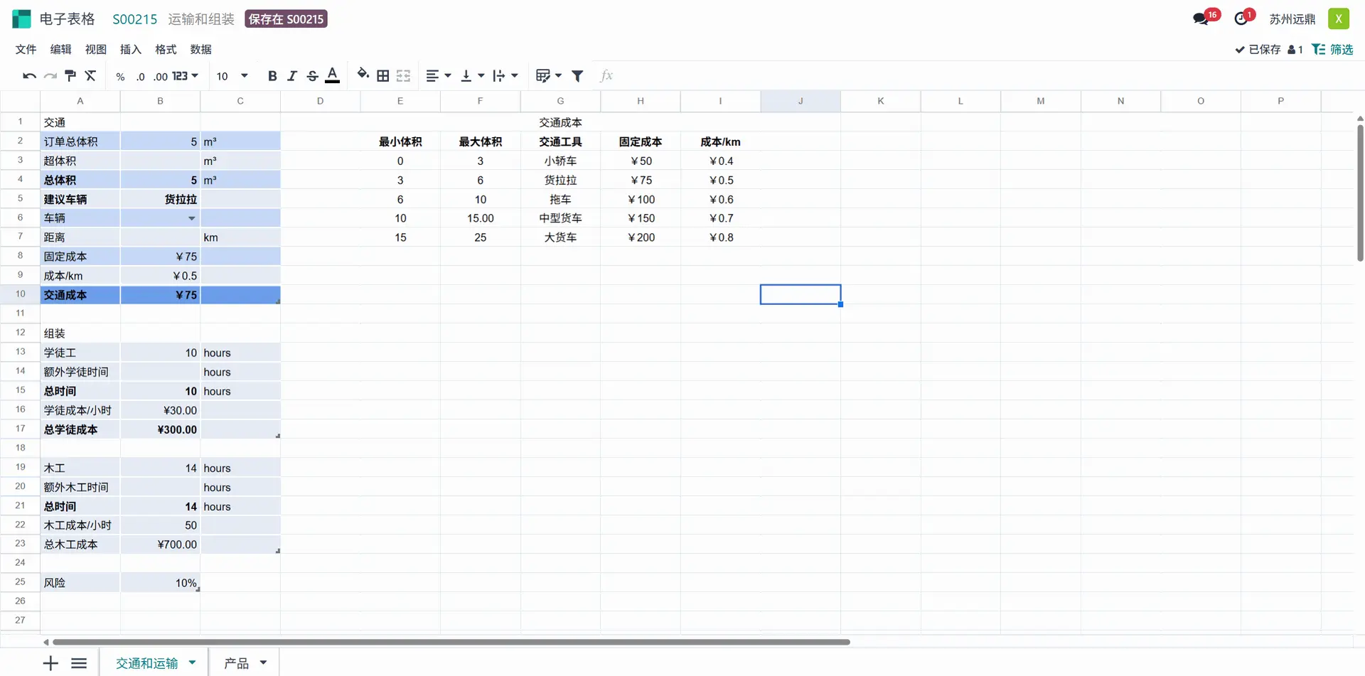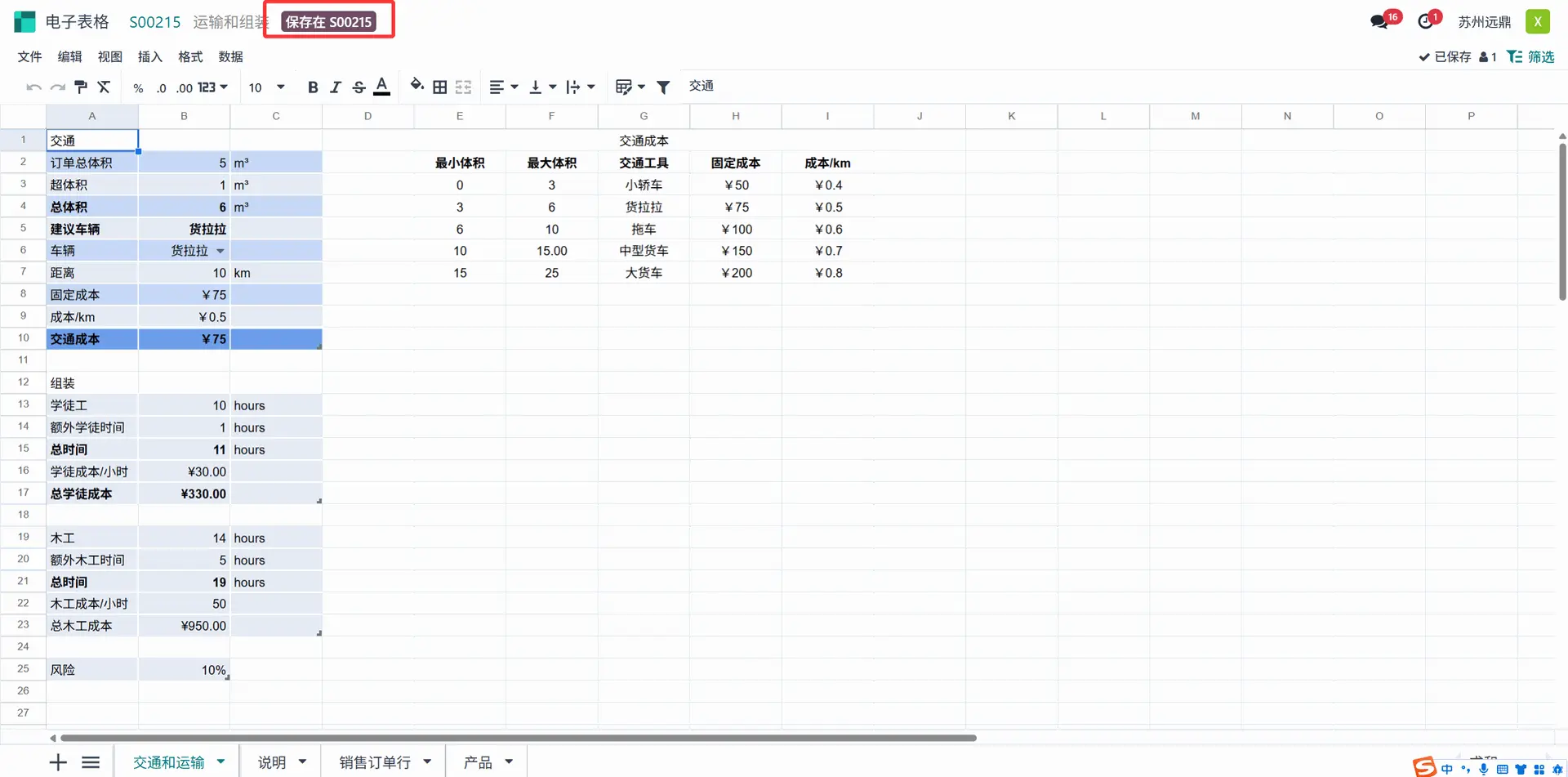 让我们先更改配置。用户在此处添加了一些“额外体积”。这里的“推荐车辆”是中型货车,但用户选择了轻型卡车进行运输。与此同时,距离也更新为10公里。在组装部分,“额外学徒时间”更新为1.5小时,“额外木匠时间”更新为5小时。