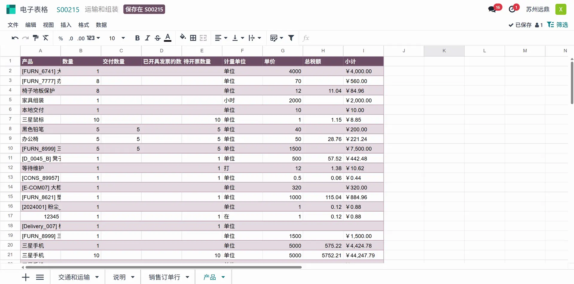 最后一张工作表名为“销售订单行”。包含已创建报价的订单行中添加的产品详细信息。如前所述,数量、计量单位、单价、税费总额、小计、新的组装和运输小计以及所需的卡车等详细信息为每个产品单独列出。