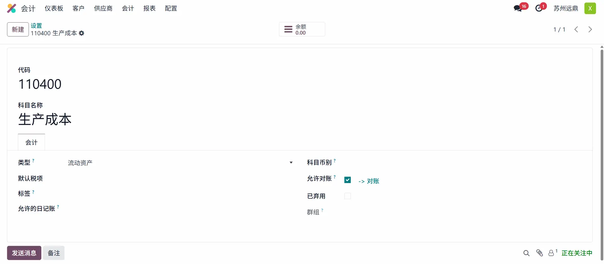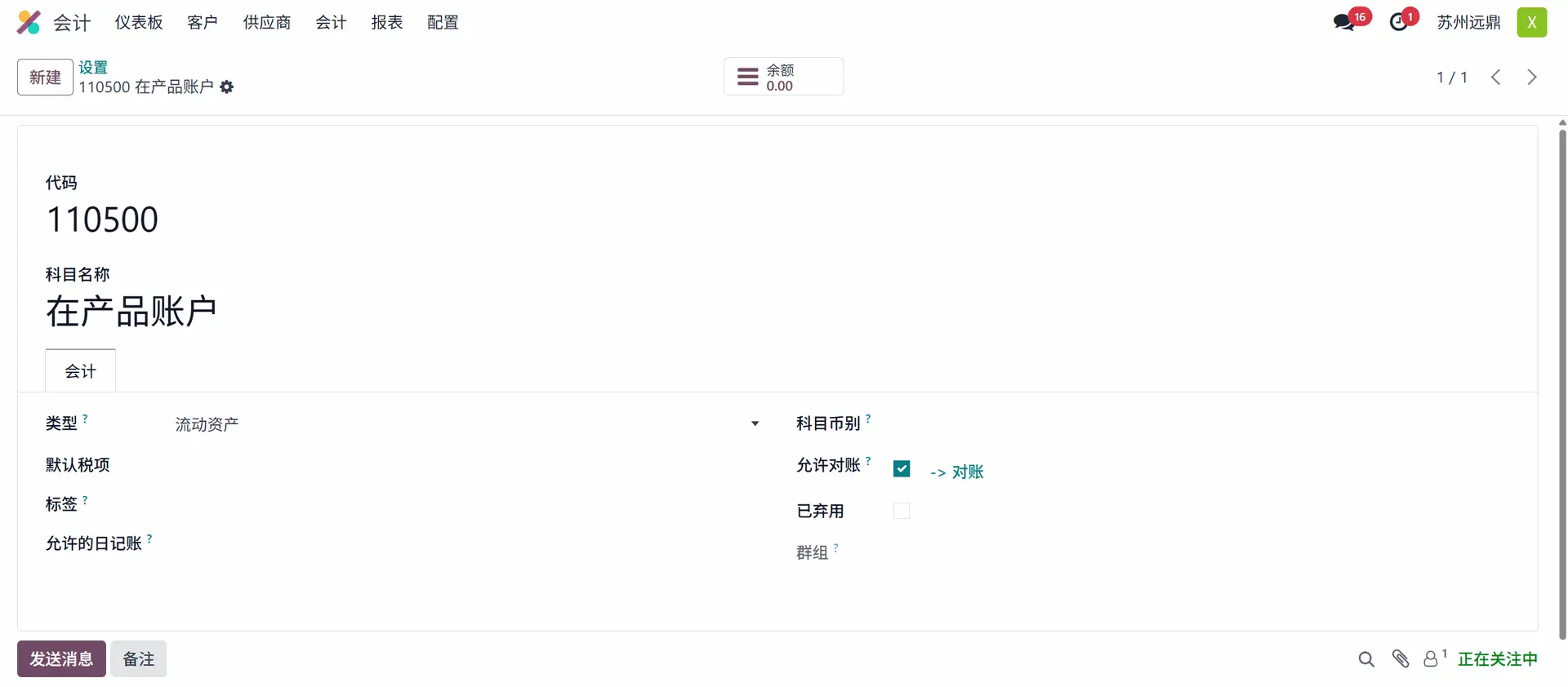 这里的第一个账户是 WIP 账户。点击账户的内部链接,将会打开会计科目表。这里账户名称为“在产品账户”(Work in Progress Account),代码为 110500。账户类型为流动资产(Current Asset)。