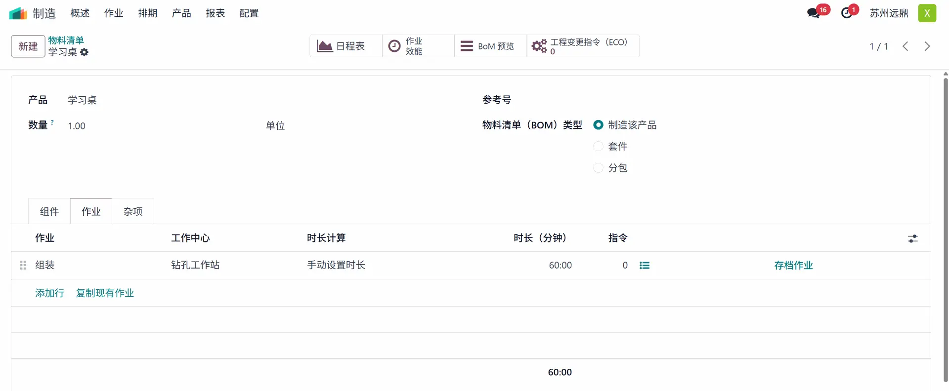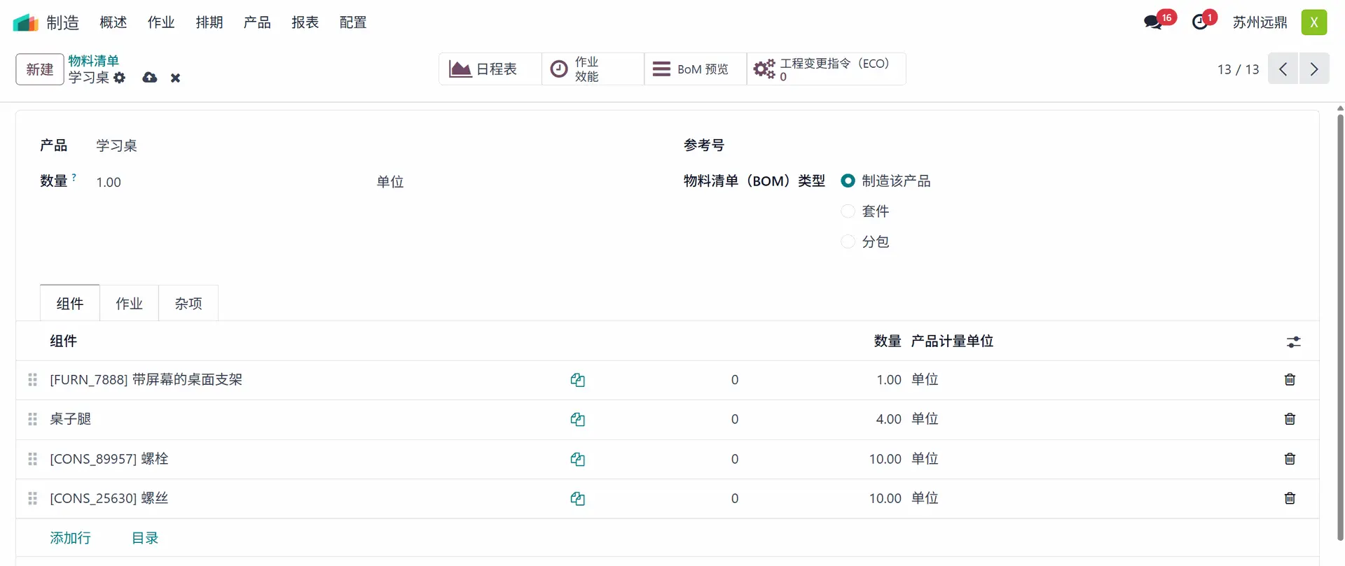 下面的截图显示了一个产品学习桌的物料清单。选择的 BoM 类型是生产此产品。“组件”(Component) 选项卡包含带有数量的原材料列表。