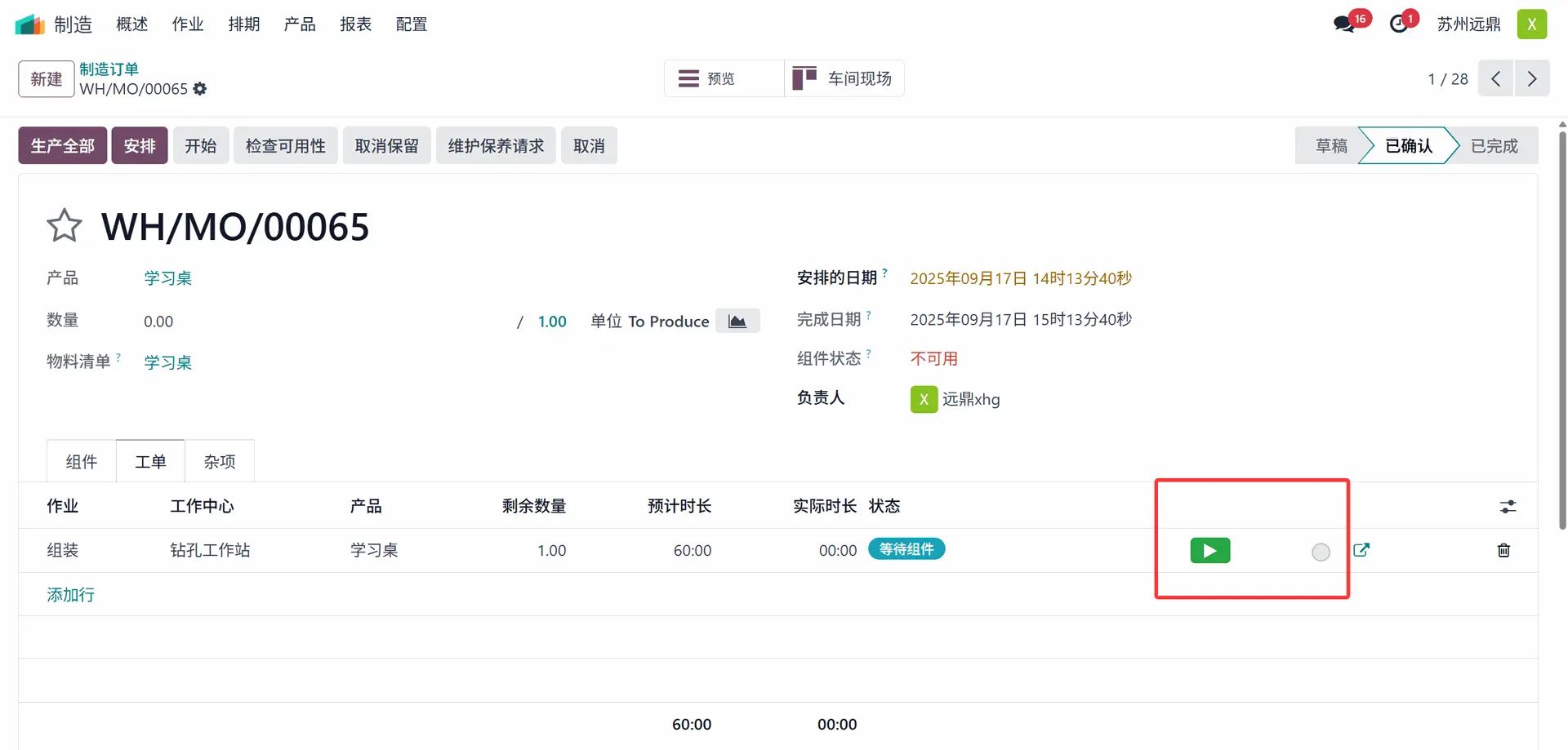 这里,用户只是暂停了工作订单。所以工作订单仍处于“进行中”(In progress) 阶段。这里完成操作的“预计持续时间”(Expected Duration) 设置为 60:00 分钟,但“当前时间”或“实际持续时间”(Real Duration) 是 16:12 分钟。
