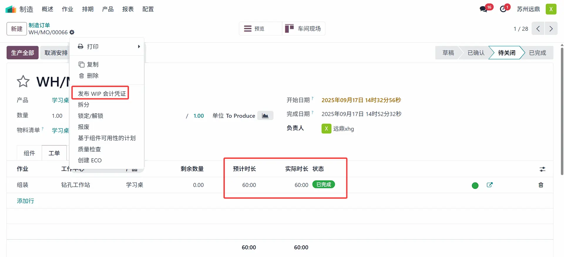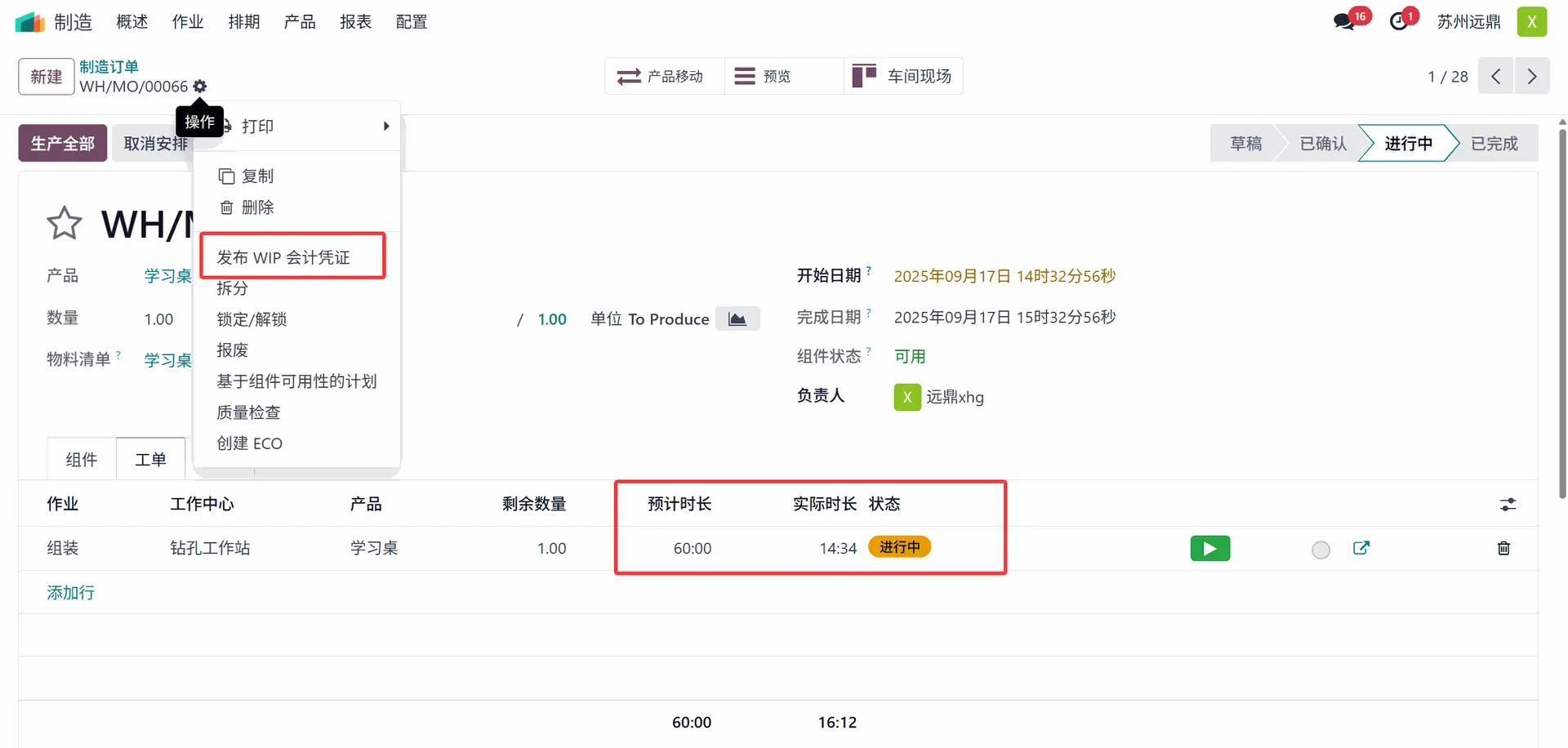 现在用户完成了操作。所以实际持续时间达到了预计持续时间,工作订单状态变为“完成”(Finished)。